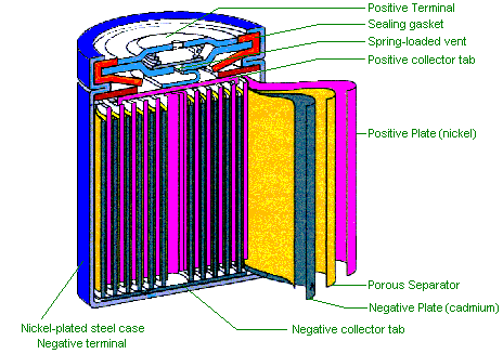A NiCad cell consists basically in a positive plate foil of nickel metal with nickel